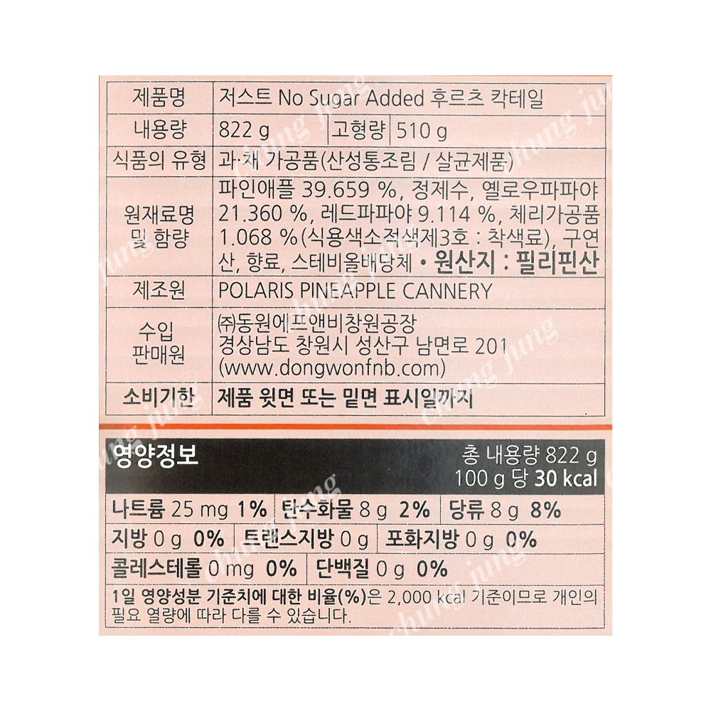 | 상품명 | 후르츠칵테일(저스트,동원,822g) | 식품유형 | 상세설명참조 |