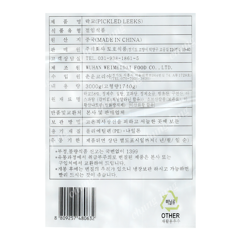 | 상품명 | 락교(토호(파우치),3S,3kg) | 식품유형 | 상세설명참조 |