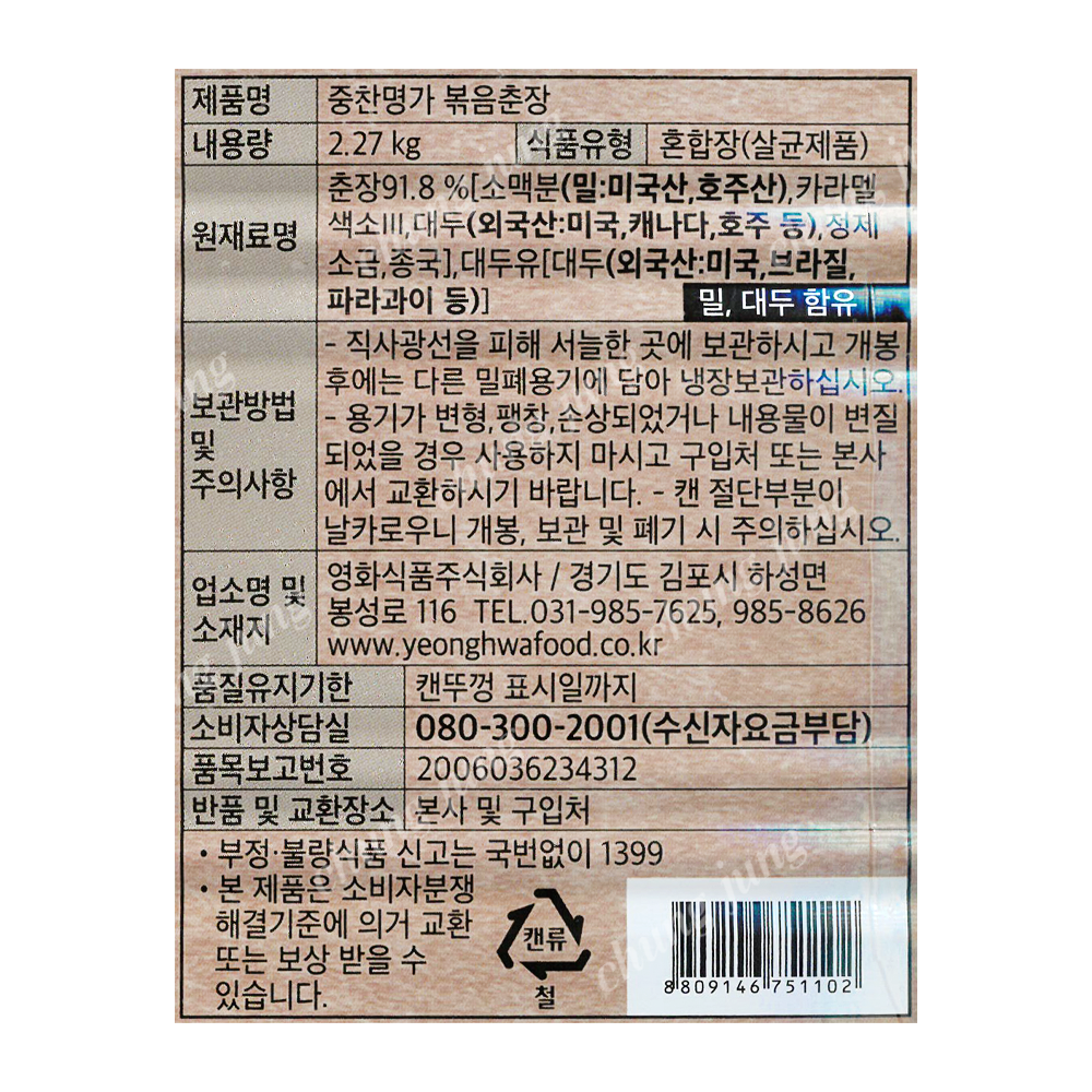 | 상품명 | 춘장(볶음,중찬명가,사자표,2.27kg) | 식품유형 | 상세설명참조 |