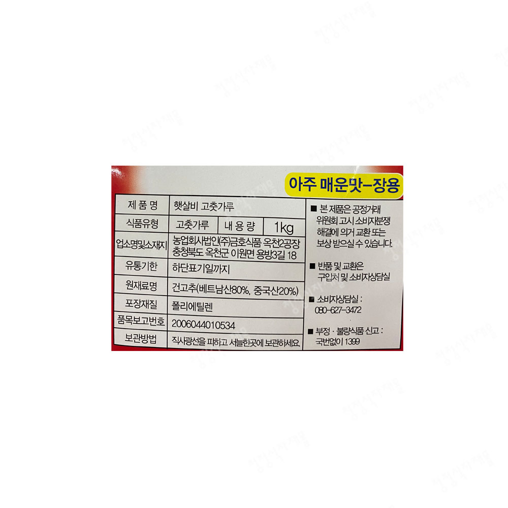 | 상품명 | 고춧가루(아주매운맛,장용,햇살비,1kg,베80%중20%) | 식품유형 | 상세설명참조 |
