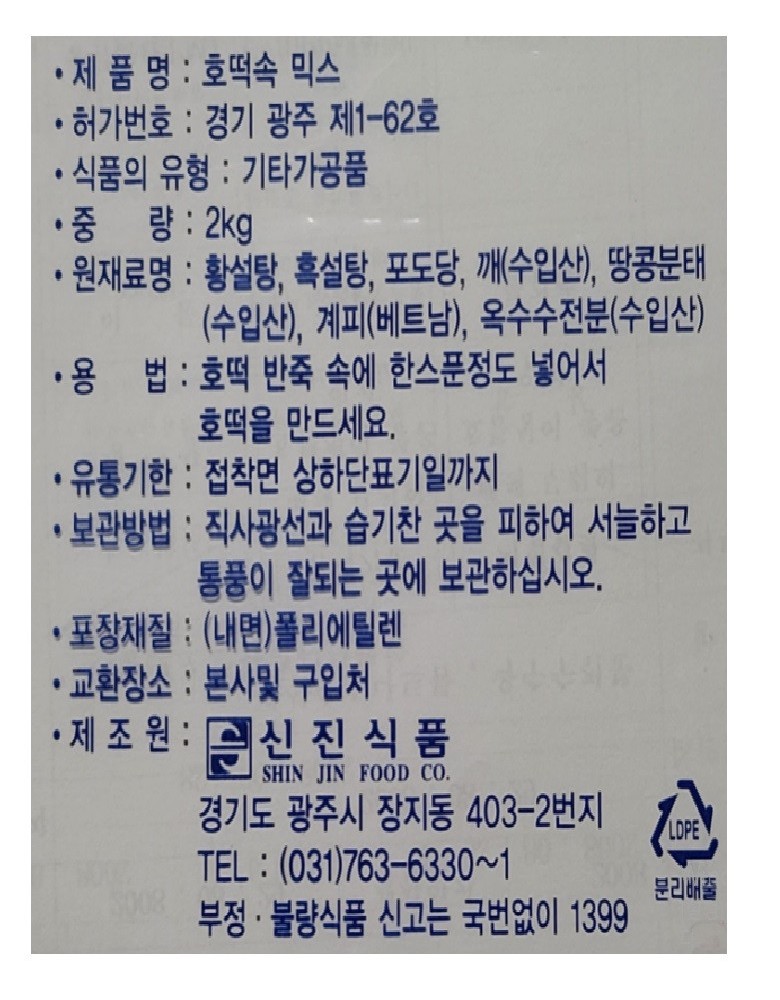 | 상품명 | 믹스(호떡속,한지붕,2kg) | 식품유형 | 상세설명참조 |