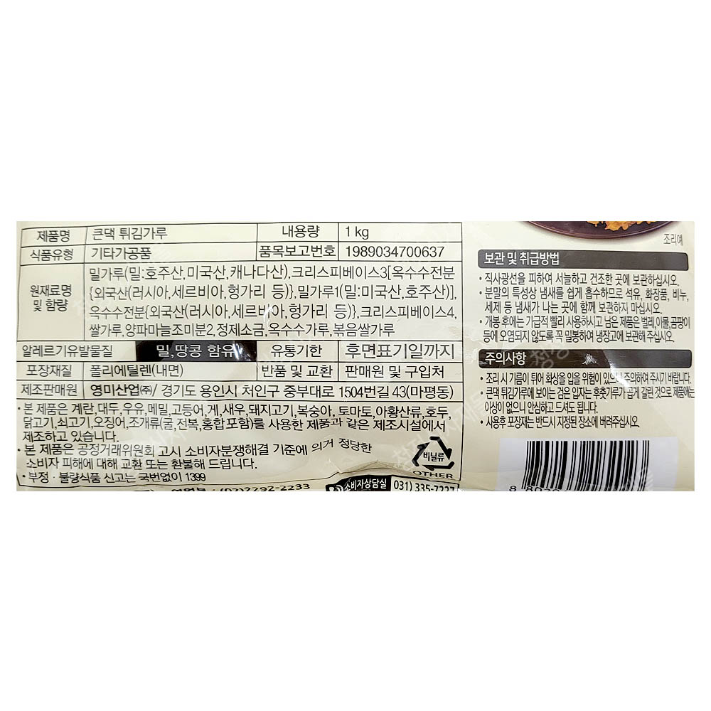 | 상품명 | 튀김가루(영미,큰댁,1kg) | 식품유형 | 상세설명참조 |