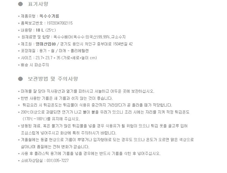 | 상품명 | 식용유(옥수수유,영미,18L) | 식품유형 | 상세설명참조 |