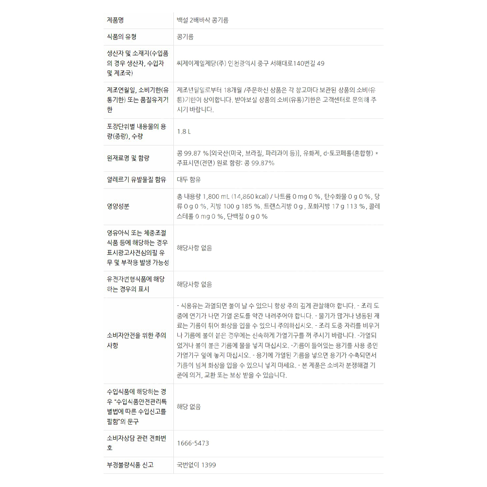 | 상품명 | 식용유(2배바삭,백설,1.8L) | 식품유형 | 상세설명참조 |