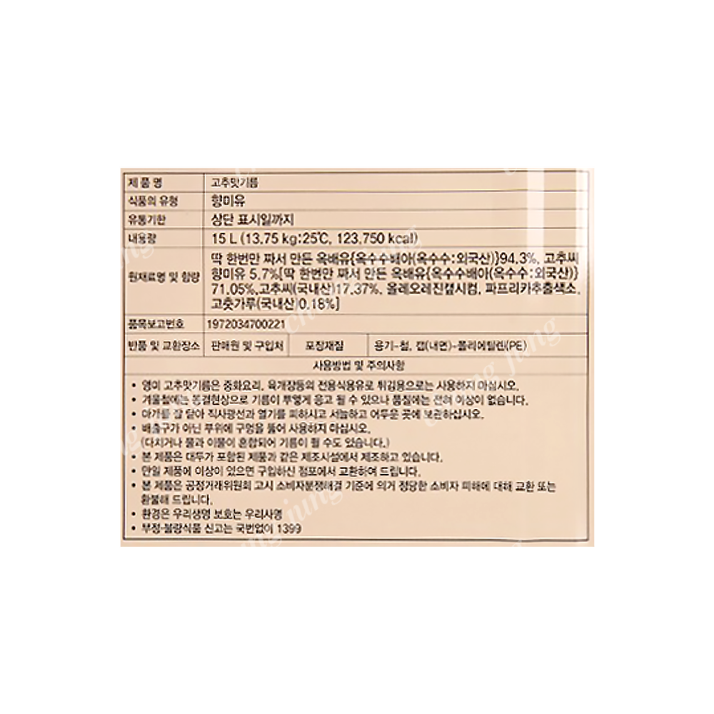 | 상품명 | 고추맛기름(영미,15L) | 식품유형 | 상세설명참조 |