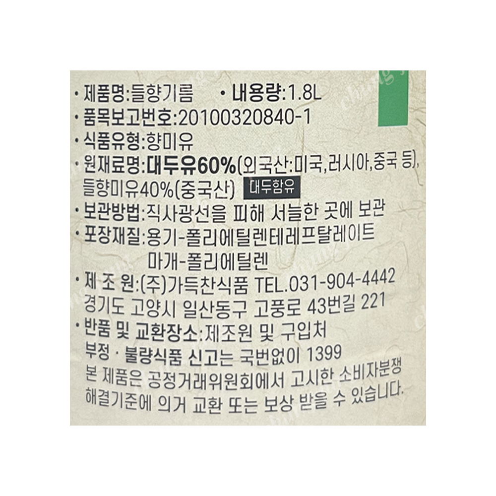 | 상품명 | 들향기름(가득찬,1.8L) | 식품유형 | 상세설명참조 |