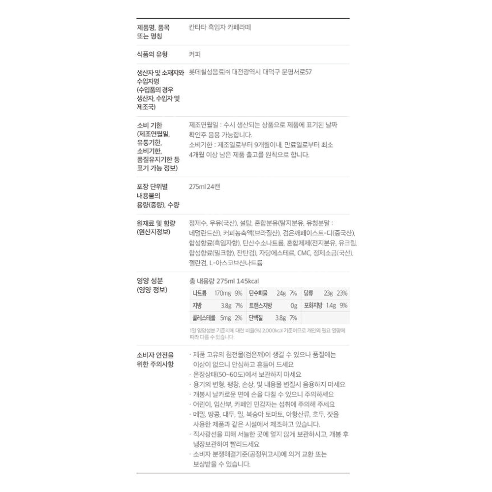 | 상품명 | 음료(흑임자라떼,칸타타,275ml) | 식품유형 | 상세설명참조 |