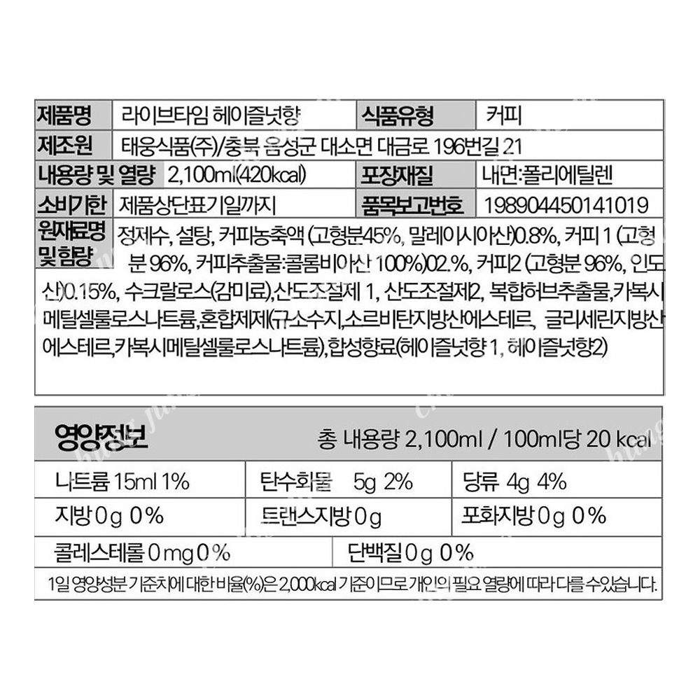 | 상품명 | 음료(헤이즐넛향,라이브타임,2.1L) | 식품유형 | 상세설명참조 |