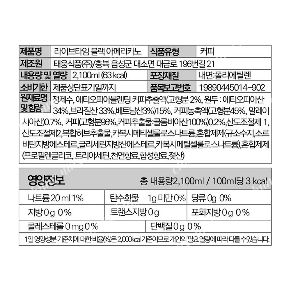 | 상품명 | 음료(블랙아메리카노,라이브타임,2.1L) | 식품유형 | 상세설명참조 |