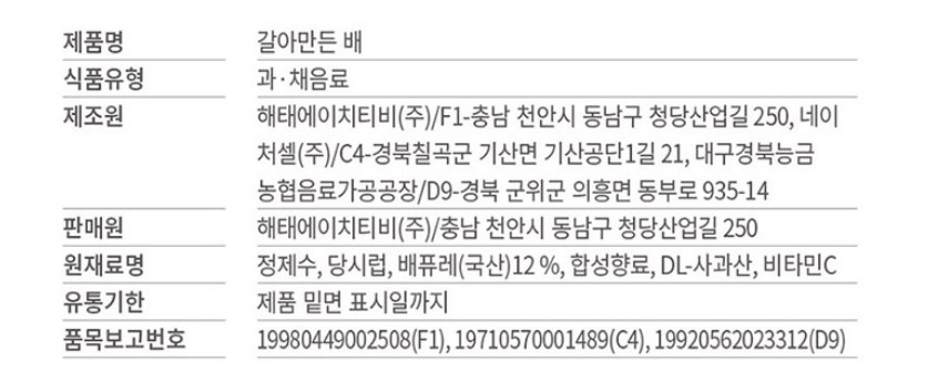 | 상품명 | 해태갈아만든배238ml*24입 | 식품유형 | 상세설명참조 |