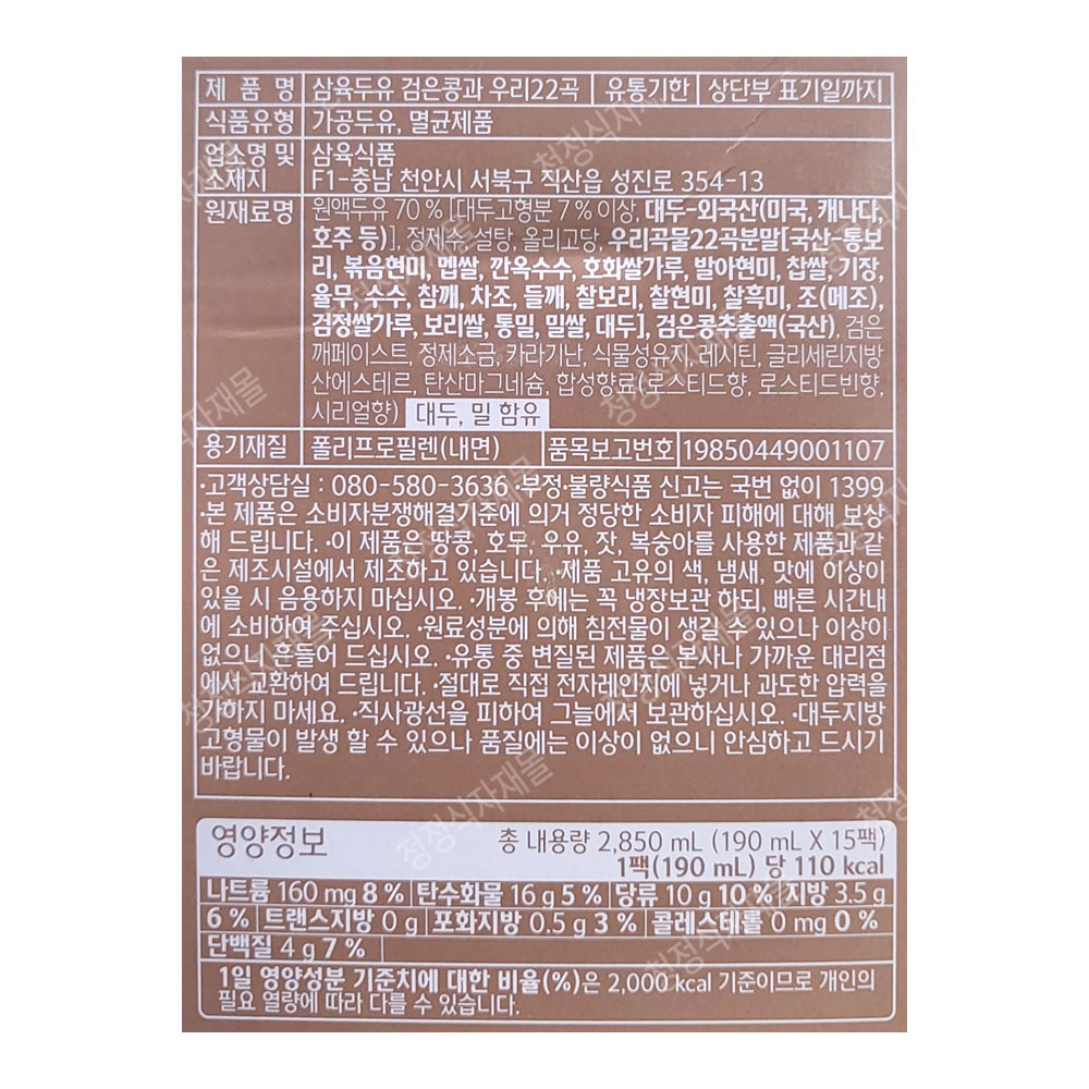 | 상품명 | 두유(검은콩과우리22곡,삼육,190ml*15입) | 식품유형 | 상세설명참조 |