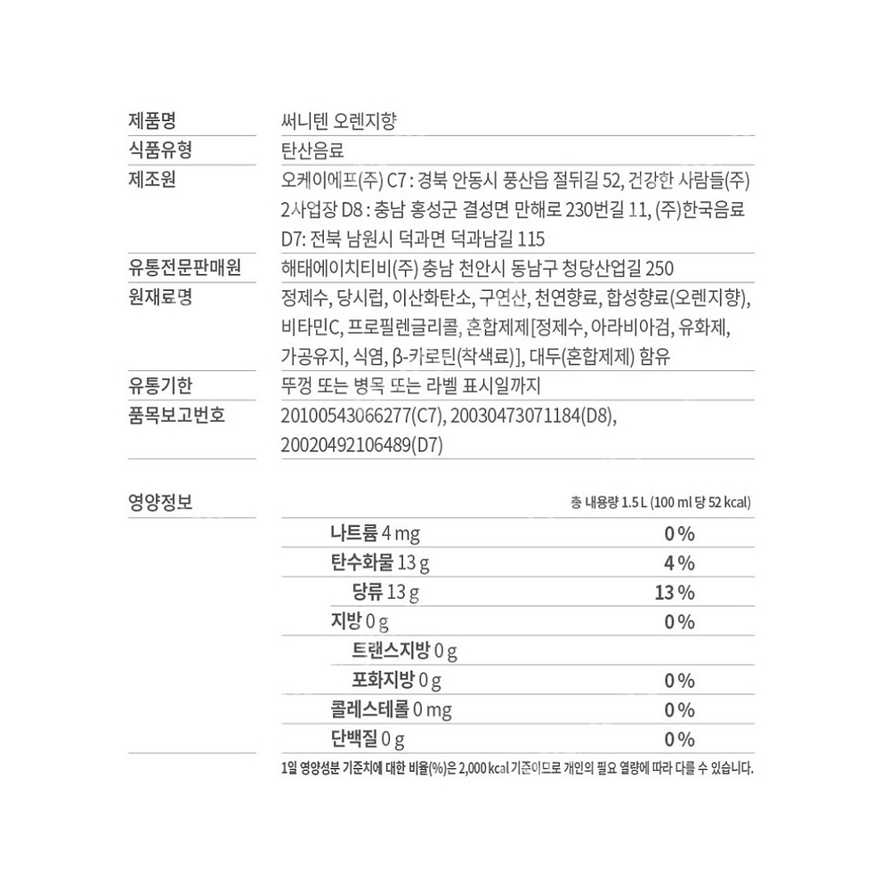 | 상품명 | 음료(써니텐오렌지,1.5L) | 식품유형 | 상세설명참조 |