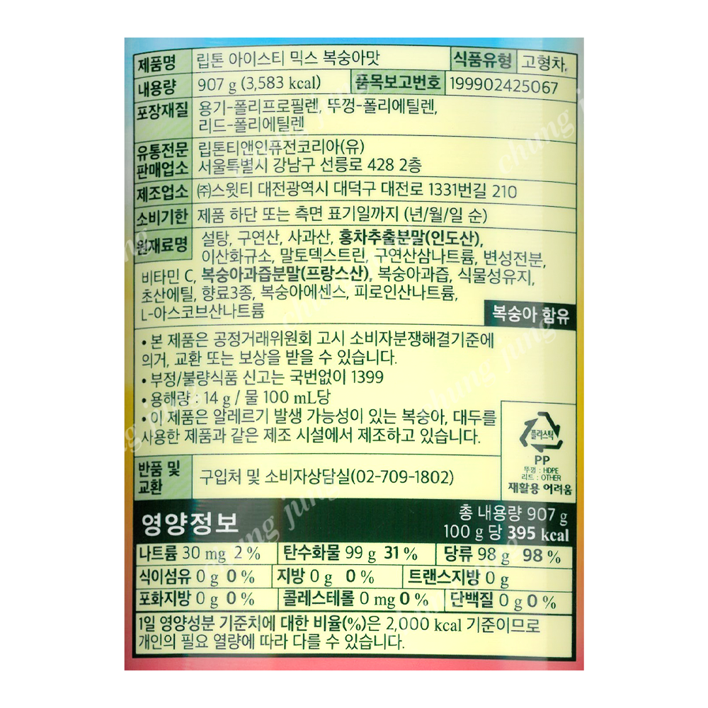 | 상품명 | 아이스티(복숭아,립톤,907g) | 식품유형 | 상세설명참조 |