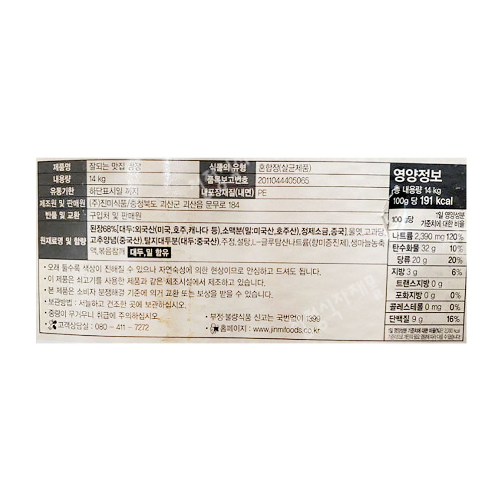 | 상품명 | 쌈장(잘되는맛집(지함),진미,14kg)(종이포장) | 식품유형 | 상세설명참조 |