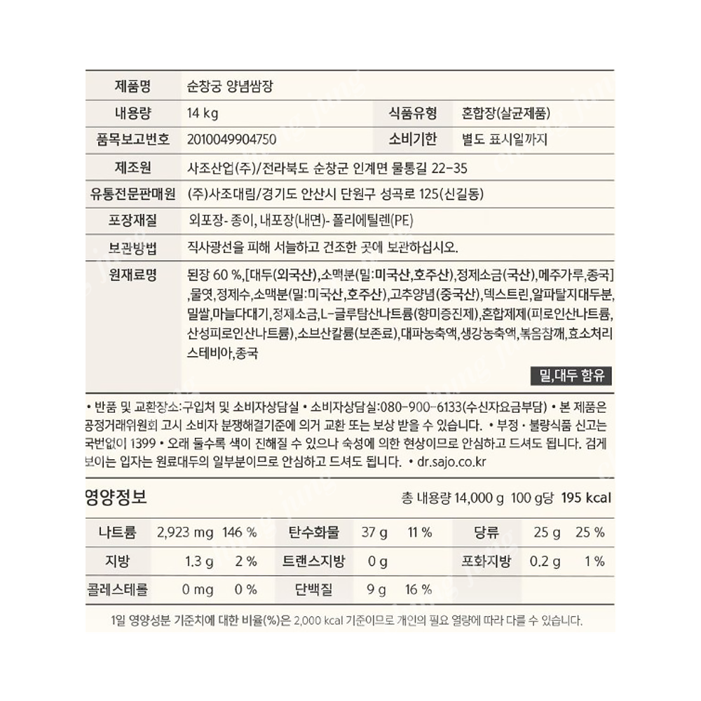 | 상품명 | 쌈장(순창궁양념(지함),해표,14kg) | 식품유형 | 상세설명참조 |