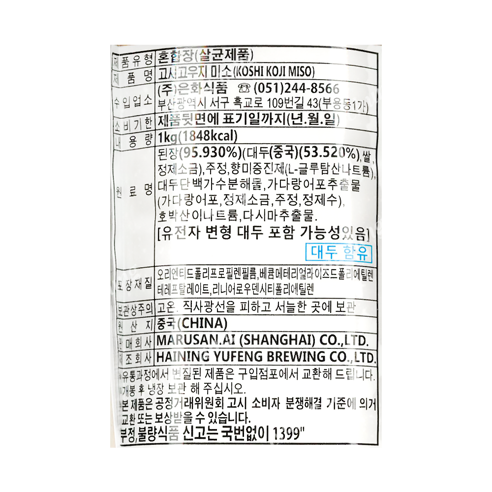 | 상품명 | 된장(CN,고시고우지미소(백),은화,1kg) | 식품유형 | 상세설명참조 |