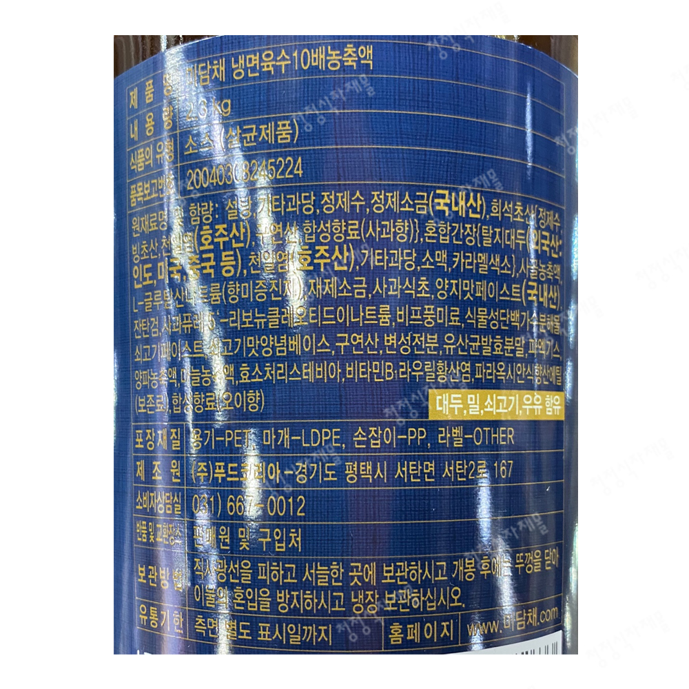 | 상품명 | 농축액(냉면육수,미담채,2.3kg) | 식품유형 | 상세설명참조 |