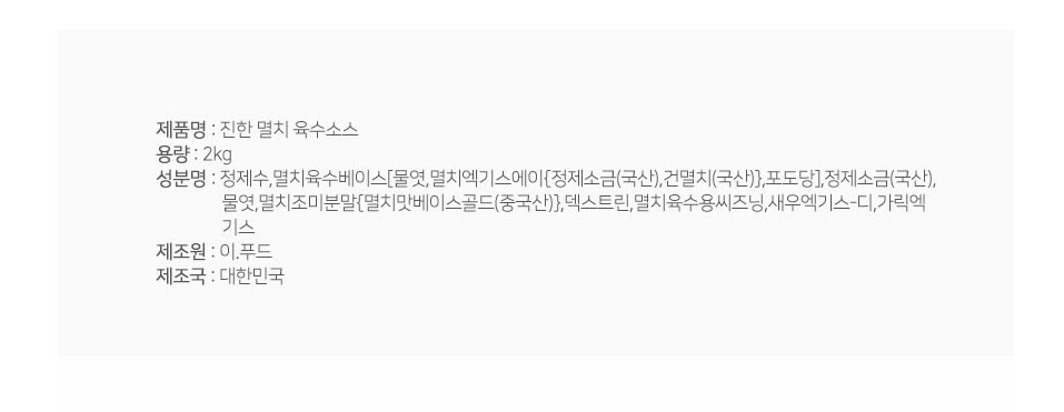 | 상품명 | 육수(진한멸치,쉐프원,2kg) | 식품유형 | 상세설명참조 |