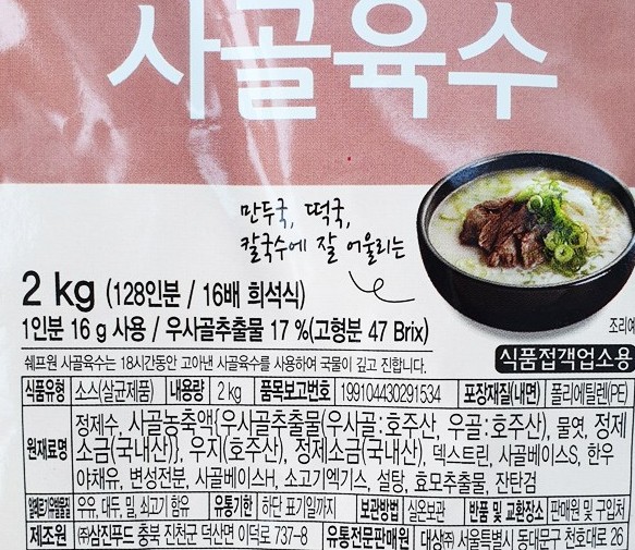 | 상품명 | 사골육수(18시간고아낸,쉐프원,2kg) | 식품유형 | 상세설명참조 |