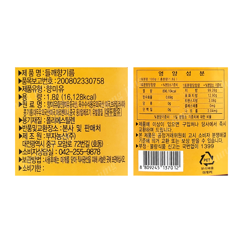 | 상품명 | 들향기름(부자농산,1.8L) | 식품유형 | 상세설명참조 |