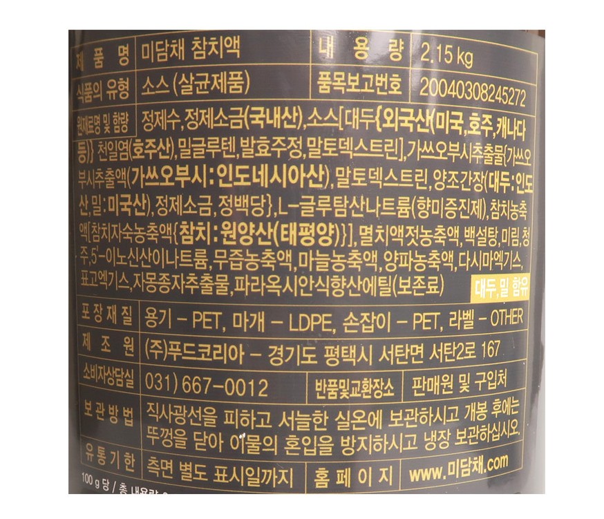 | 상품명 | 참치액(미담채,2.15kg) | 식품유형 | 상세설명참조 |