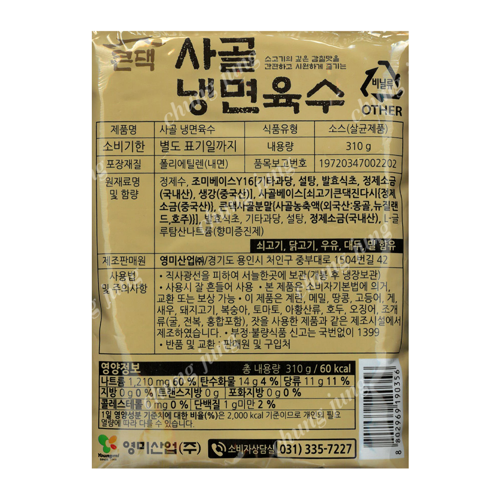 | 상품명 | 냉면육수(상온,사골,큰댁,310g*30입)박스 | 식품유형 | 상세설명참조 |