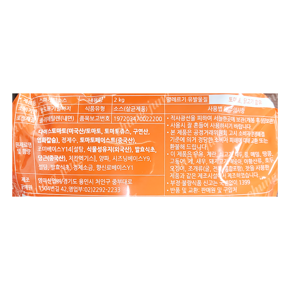 | 상품명 | 소스(토마토스파게티,큰댁,2kg+2kg) | 식품유형 | 상세설명참조 |