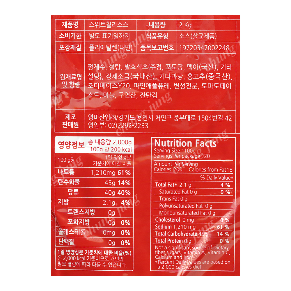 | 상품명 | 소스(스위트칠리,큰댁,2kg+2kg) | 식품유형 | 상세설명참조 |