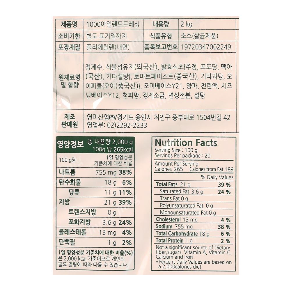 | 상품명 | 소스(1000아일랜드,큰댁,2kg+2kg) | 식품유형 | 상세설명참조 |