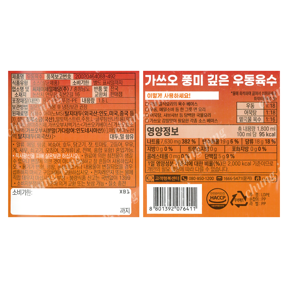 | 상품명 | 육수(우동,CJ제일제당,1.8L) | 식품유형 | 상세설명참조 |