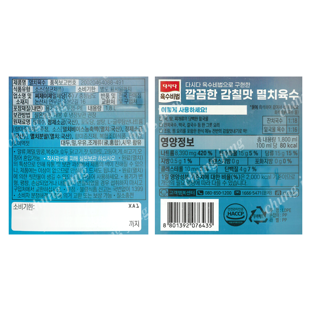 | 상품명 | 육수(멸치,CJ제일제당,1.8L) | 식품유형 | 상세설명참조 |