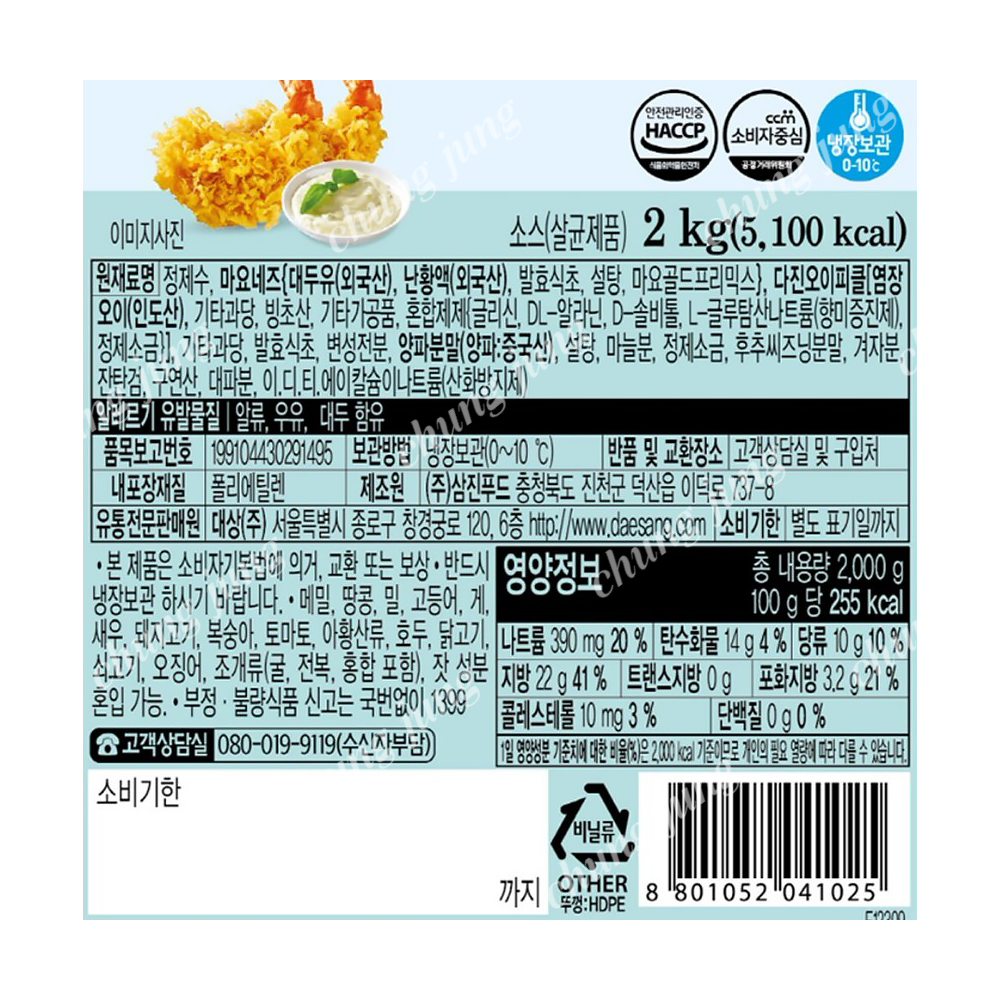 | 상품명 | 소스(타르타르,쉐프원,2kg) | 식품유형 | 상세설명참조 |