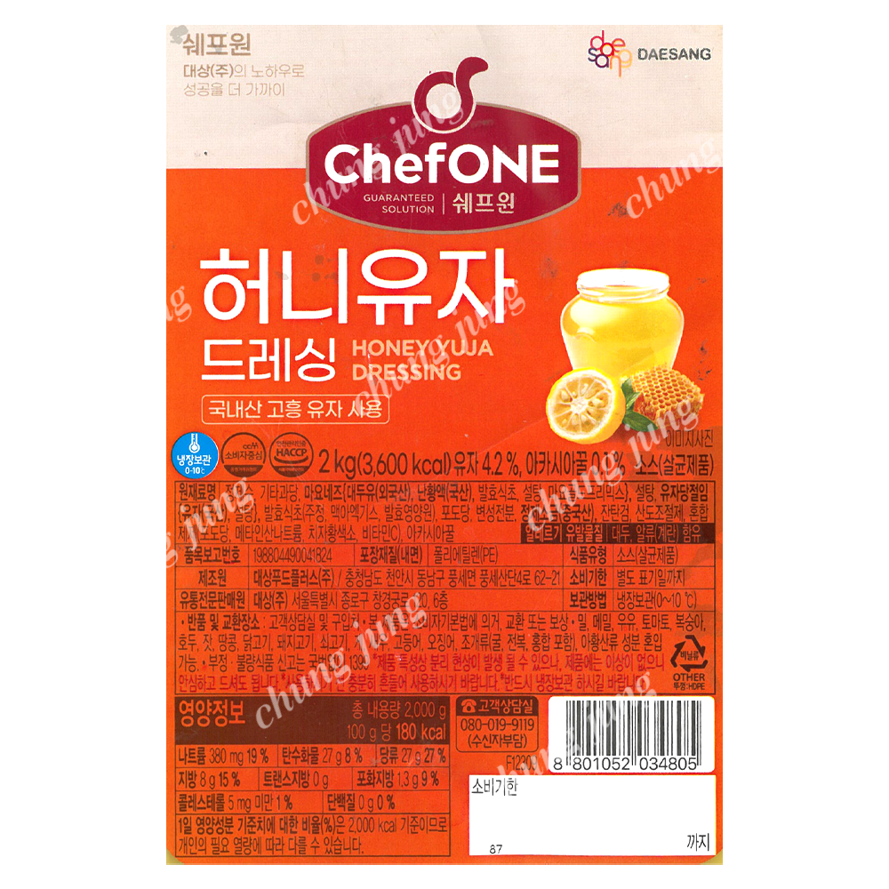 | 상품명 | 소스(허니유자드레싱,쉐프원,2kg) | 식품유형 | 상세설명참조 |