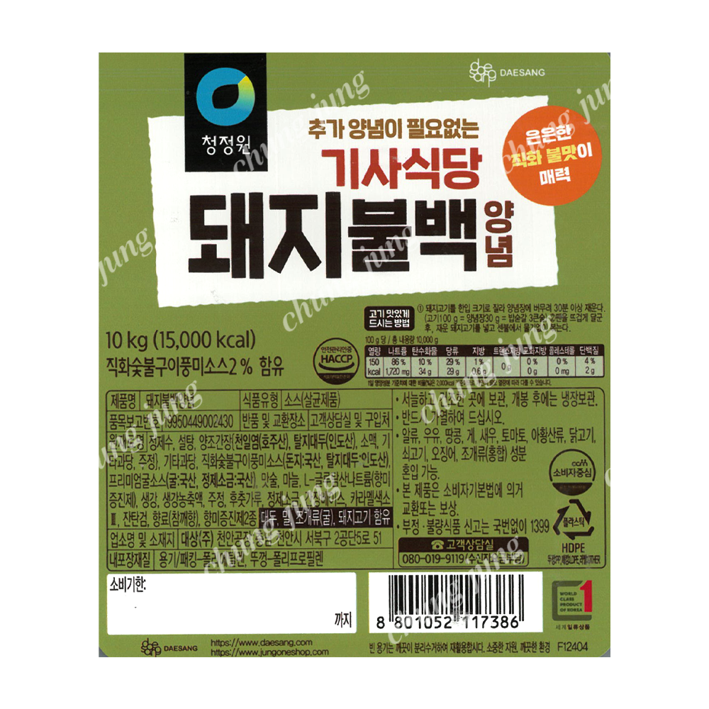 | 상품명 | 양념(기사식당돼지불백,청정원,10kg) | 식품유형 | 상세설명참조 |