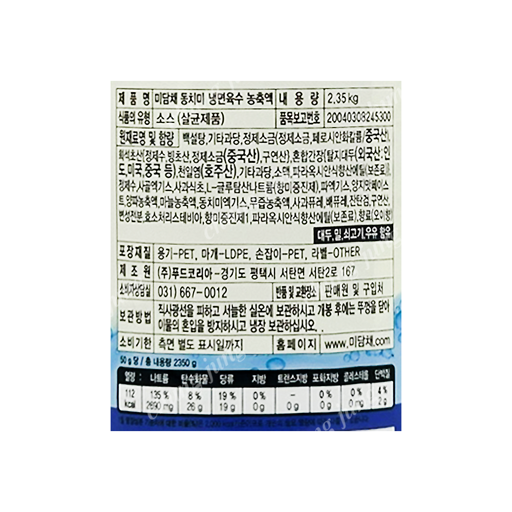 | 상품명 | PDN/농축액(동치미냉면육수,미담채,2.35kg) | 식품유형 | 상세설명참조 |