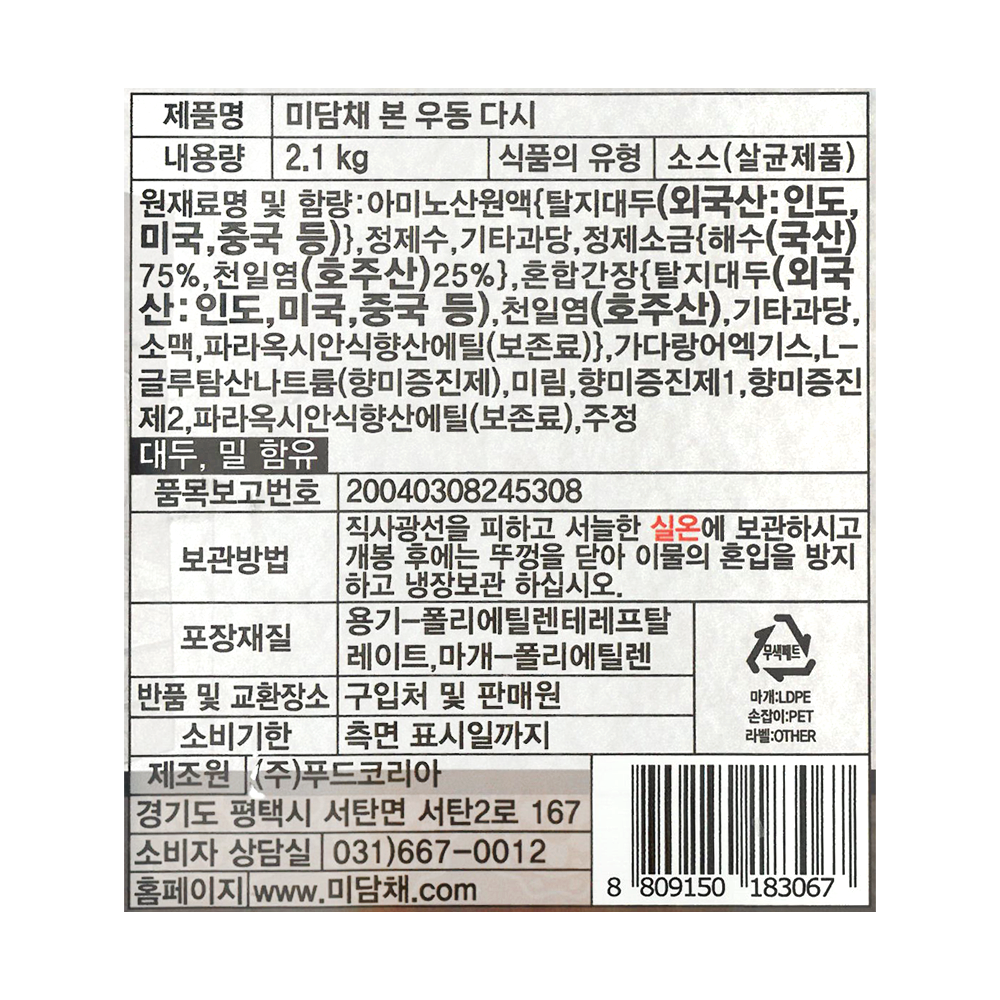 | 상품명 | PDN/우동다시(본,미담채,2kg) | 식품유형 | 상세설명참조 |