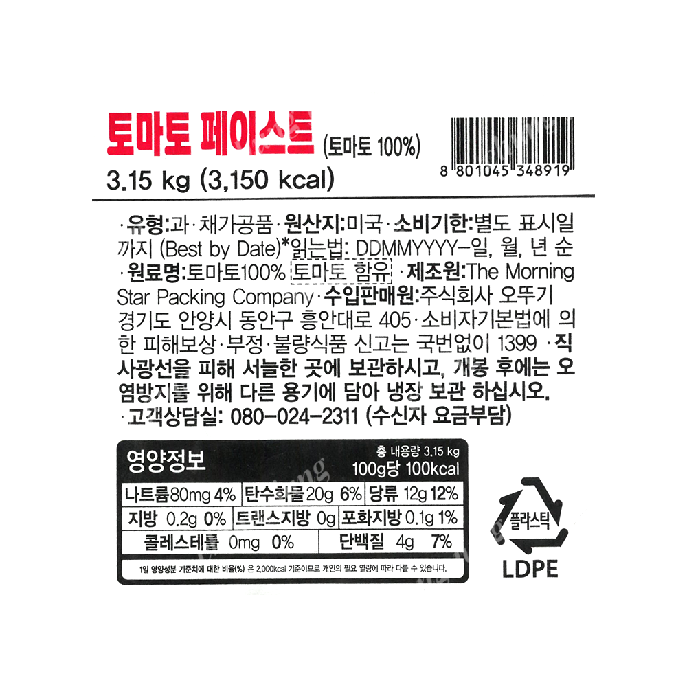 | 상품명 | 소스(토마토페이스트(파우치),오뚜기,3.15kg) | 식품유형 | 상세설명참조 |