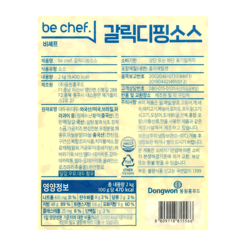 | 상품명 | 소스(갈릭디핑,동원홈,2kg) | 식품유형 | 상세설명참조 |