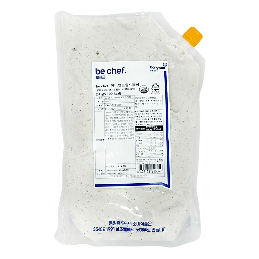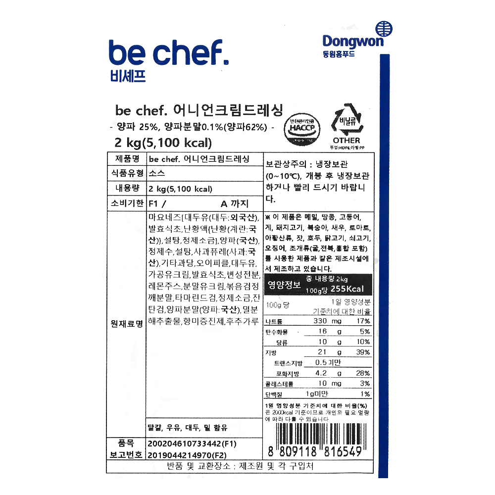 | 상품명 | 드레싱(어니언크림,동원홈,2kg) | 식품유형 | 상세설명참조 |