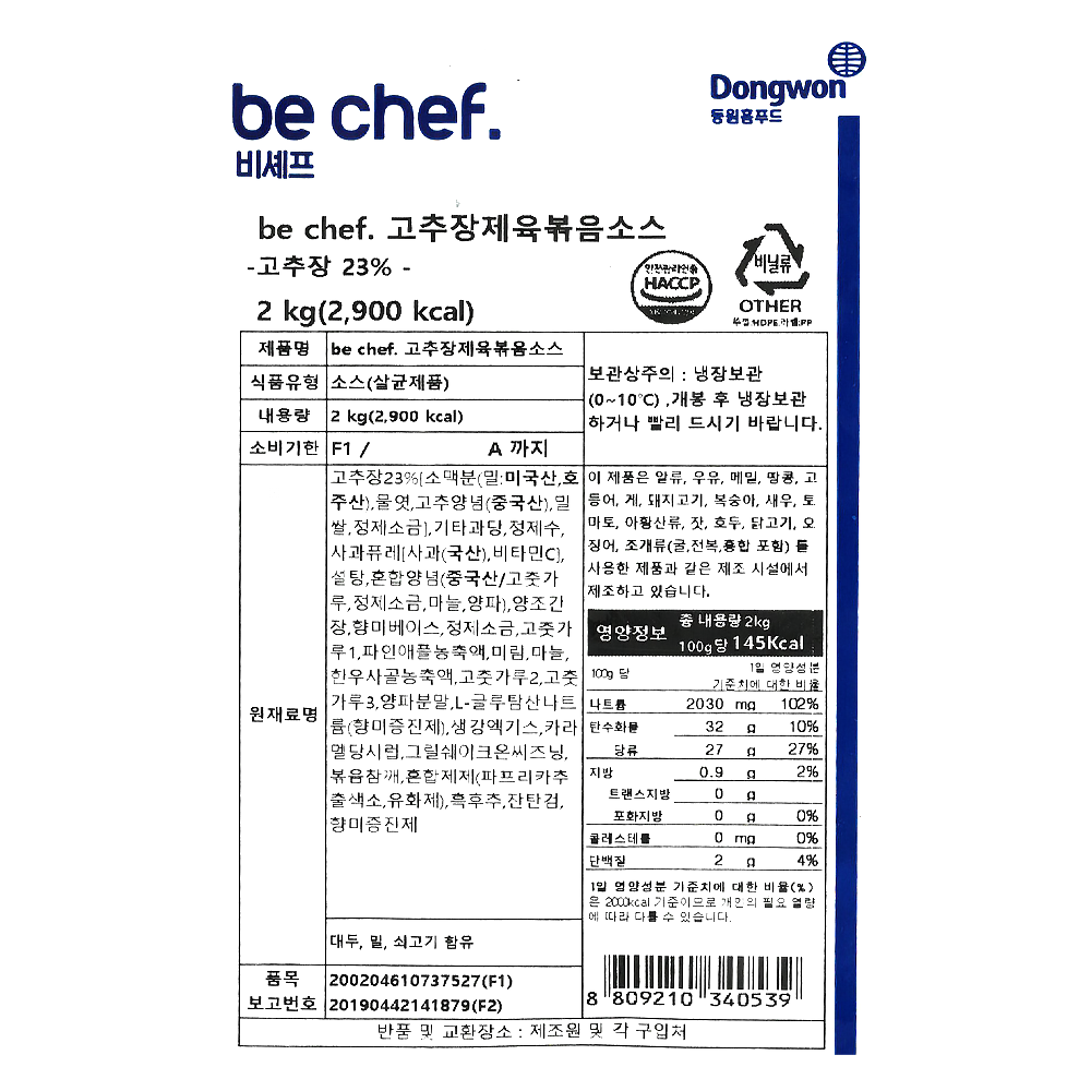 | 상품명 | 소스(고추장제육볶음,동원홈,2kg) | 식품유형 | 상세설명참조 |