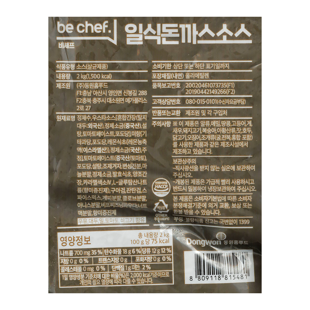 | 상품명 | 소스(일식돈까스,동원홈,2kg) | 식품유형 | 상세설명참조 |