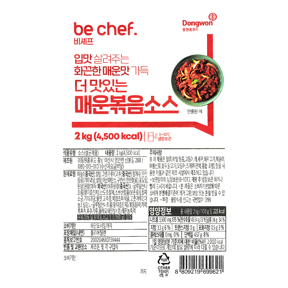 | 상품명 | 소스(매운볶음,동원홈,2kg) | 식품유형 | 상세설명참조 |