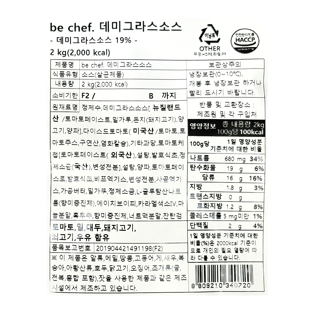| 상품명 | 소스(데미그라스,동원홈,2kg) | 식품유형 | 상세설명참조 |