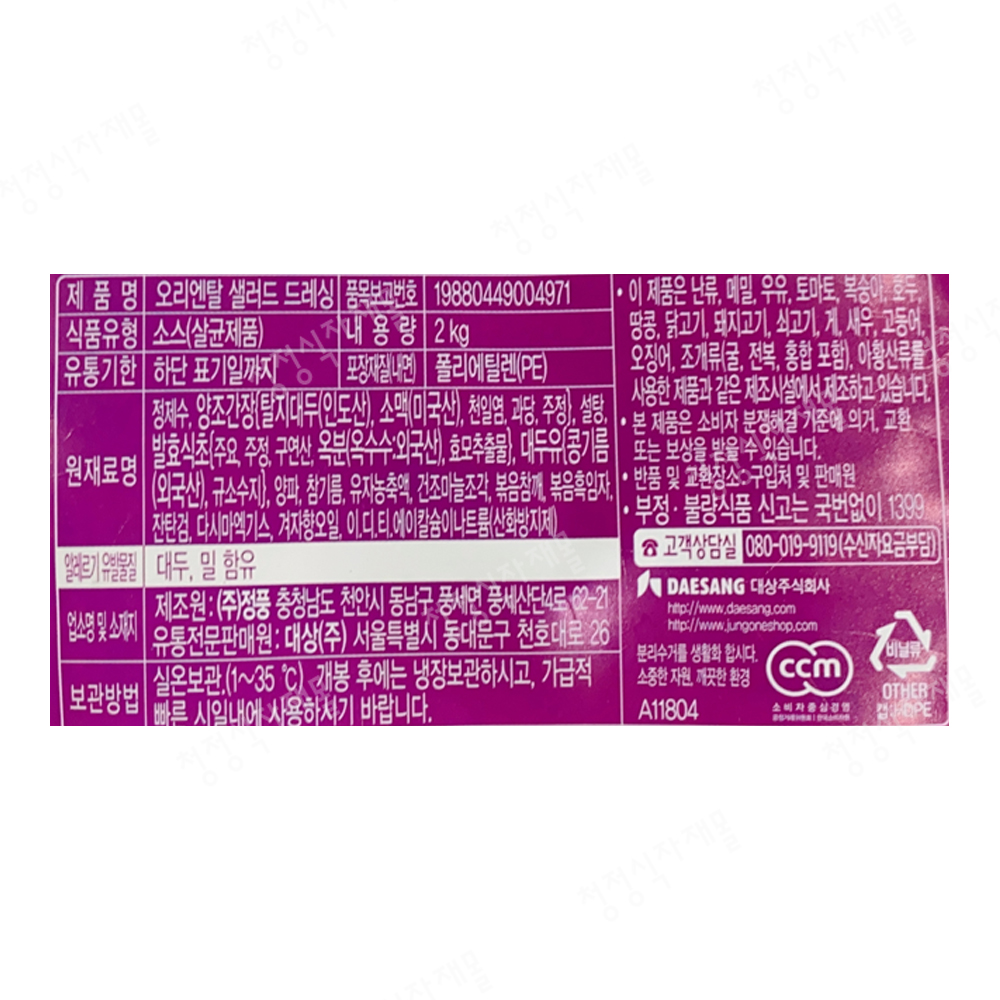 | 상품명 | 드레싱(오리엔탈,청정원,2kg) | 식품유형 | 상세설명참조 |