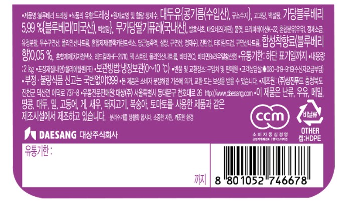 | 상품명 | 쉐프원블루베리드레싱2kg | 식품유형 | 상세설명참조 |