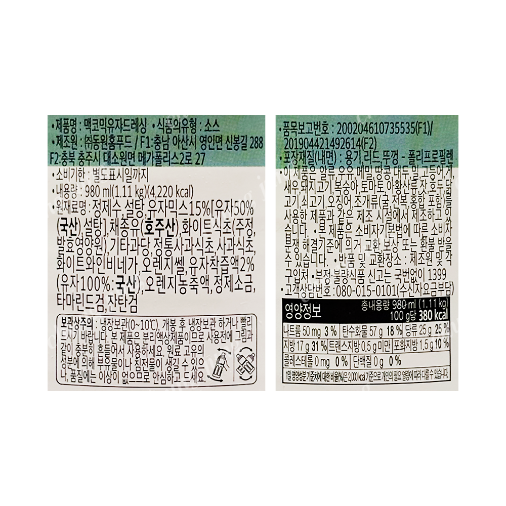 | 상품명 | 드레싱(유자,맥코믹,동원홈,1.11kg) | 식품유형 | 상세설명참조 |