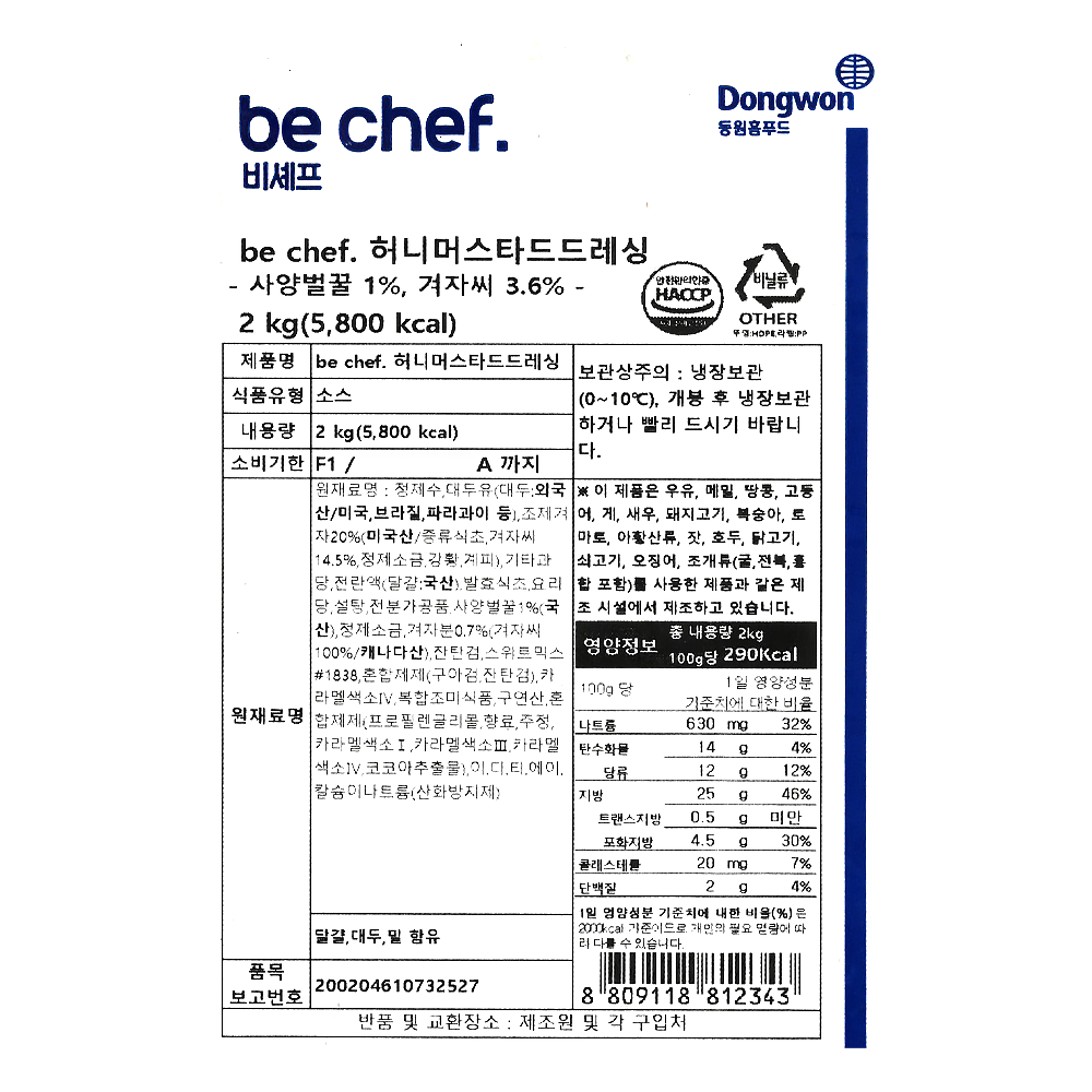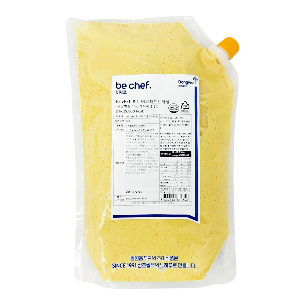 | 상품명 | 드레싱(허니머스타드,동원홈,2kg) | 식품유형 | 상세설명참조 |