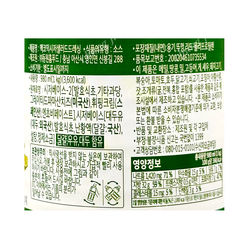 | 상품명 | 드레싱(시저,맥코믹,동원홈,1kg) | 식품유형 | 상세설명참조 |