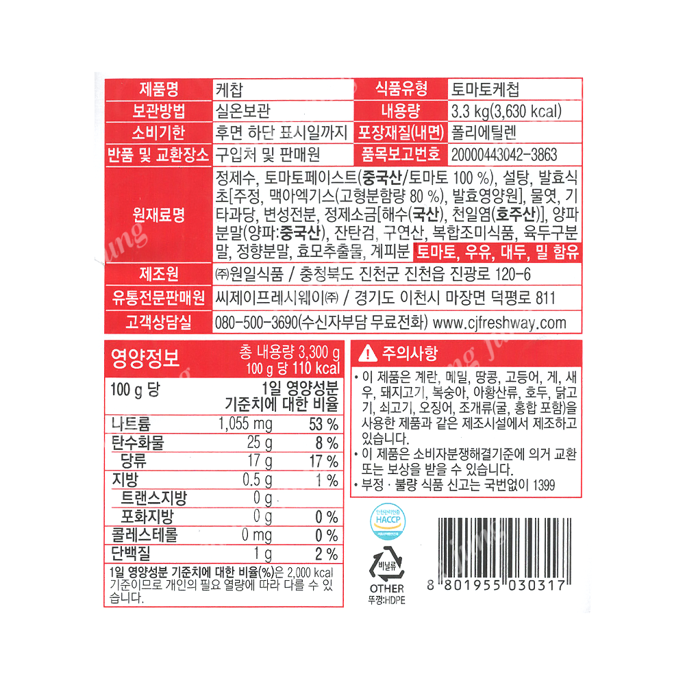 | 상품명 | 케찹(스파우트팩,이츠웰,3.3kg) | 식품유형 | 상세설명참조 |
