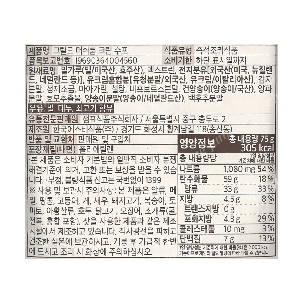 | 상품명 | 스프(그릴드머쉬룸크림,폰타나,75g) | 식품유형 | 상세설명참조 |